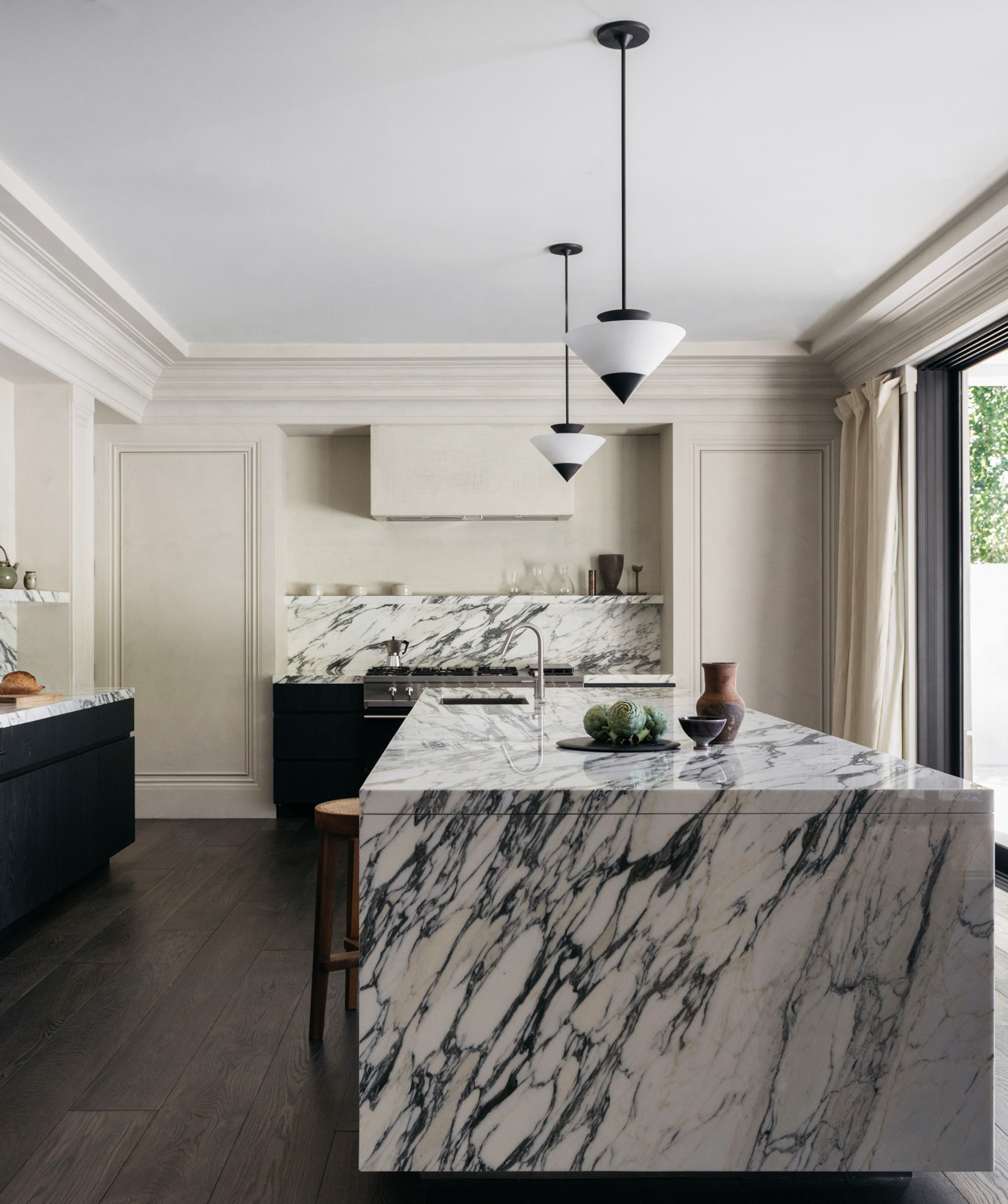 The exterior façade is a nod to the Parisian cityscape, where old and new blend harmoniously yet contrast to define each other. The interior continues this style with classical detailed moldings that have a heavy presence through-out; this is balanced by the clean lines of modern cabinetry and carefully selected finishes of differentiating textures. A muted lime wash paint palette blends these elements and adds another layer of aged character to the residence.
